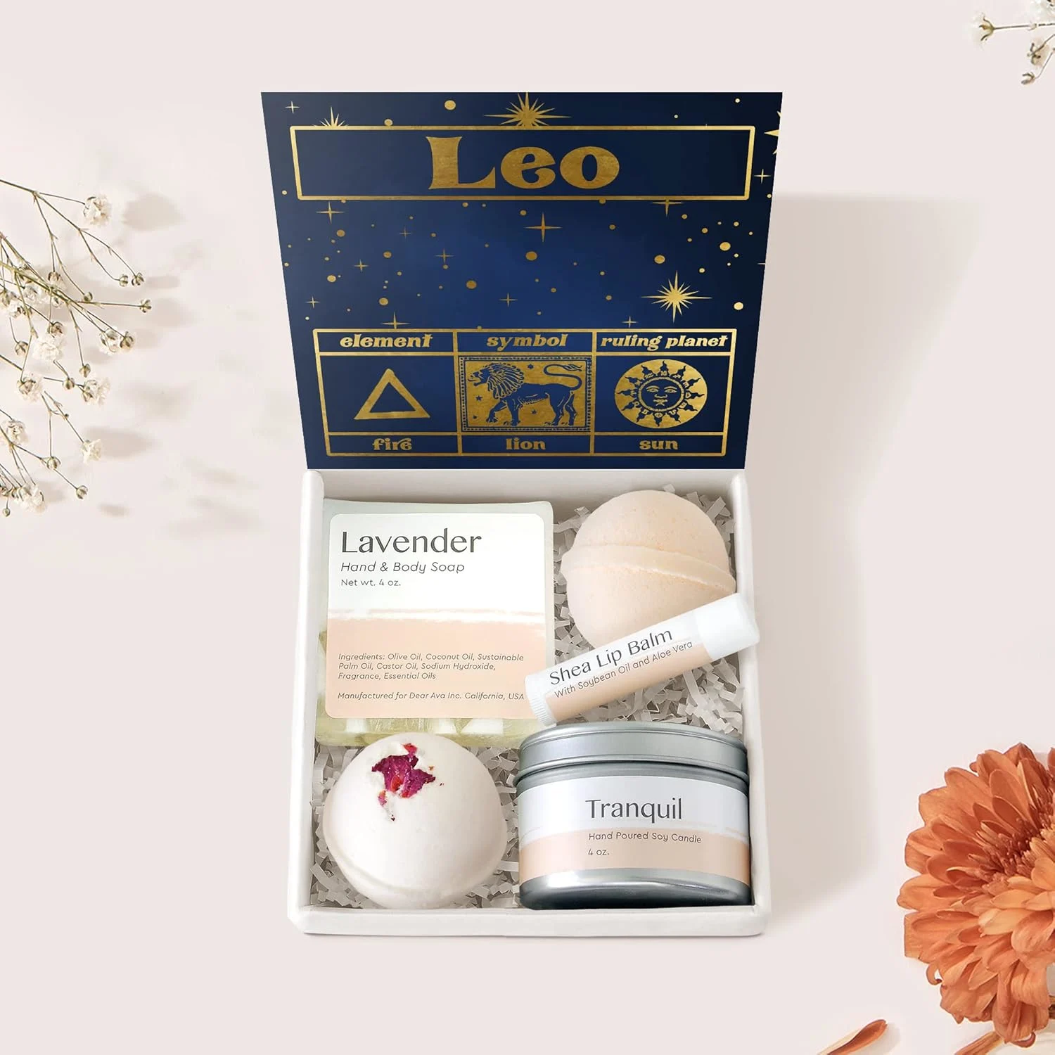 - Astrology-themed self-care kit – Include a Leo candle, bath bomb, and a little Leo-themed affirmation card.